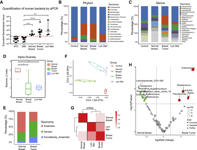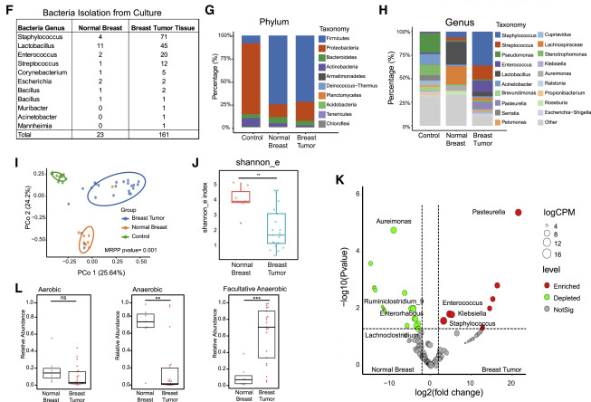 自發(fā)小鼠BT含有大量的活細(xì)菌研究人員通過(guò)16S測(cè)序全面描述組織駐留菌群的組成。對(duì)16S文庫(kù)構(gòu)建流程進(jìn)行了優(yōu)化,通過(guò)添加生物素富集步驟來(lái)減少非特異性基因組序列,比傳統(tǒng)方法檢測(cè)腸道菌群的靈敏度顯著提高。據(jù)此,研究分析了正常組織和腫瘤組織中的微生物群(圖1)。無(wú)監(jiān)督聚類分析顯示,對(duì)照(NTC和EBC)、正常乳腺組織和BT組織具有明顯的微生物群落(圖1I)。陰性對(duì)照樣品中大部分微生物為變形菌門(Proteobacteria,圖1G和S1I),而組織樣品富集為厚壁菌門(Firmicutes,圖1G)。研究數(shù)據(jù)共同表明PyMT自發(fā)性腫瘤中含有大量的活菌。