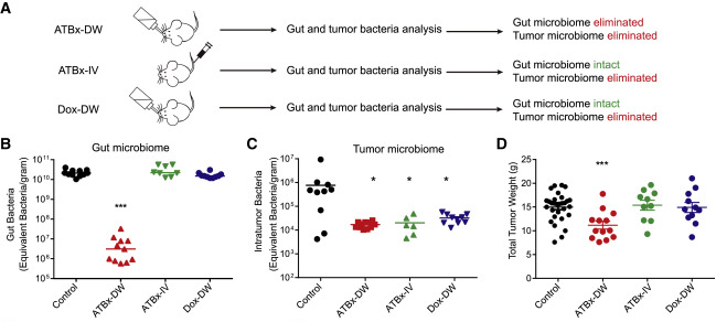 清除腫瘤內(nèi)的微生物會(huì)阻礙腫瘤的轉(zhuǎn)移,但不會(huì)阻礙原發(fā)腫瘤的生長(zhǎng)通過(guò)測(cè)試不同的抗生素組合和給藥途徑來(lái)選擇性地消除腫瘤駐留或腸道微生物群(圖3A)。研究發(fā)現(xiàn)使用雞尾酒抗生素(ATBx),通過(guò)飲用水(DW)可以有效清除腸道和腫瘤微生物菌群。當(dāng)ATBx經(jīng)尾靜脈靜脈注射時(shí),腫瘤菌群被清除,而腸道菌群保持完整(圖3B和3C)。通過(guò)DW給藥穿透細(xì)胞膜的抗生素多西環(huán)素具有與ATBx-IV相似的效果(圖3B和3C)。最重要的是,ATBx-IV和Dox-DW處理在腸道活菌數(shù)量、腸道微生物群譜和腫瘤免疫譜方面與對(duì)照組保持相當(dāng)(圖S3A S3D和S3F S3I)。結(jié)果發(fā)現(xiàn)ATBx-DW能有效地減緩自發(fā)MMTV-PyMT BTs的腫瘤生長(zhǎng)(總腫瘤重量為15±對(duì)照組為0.5g,而ATBx-DW為11±0.8g),而單獨(dú)用ATBx-IV或Dox-DW消除腫瘤微生物群并不影響腫瘤總重量(圖3D)。這表明腸道菌群在腫瘤生長(zhǎng)中起著重要作用,而腫瘤菌群則不然。