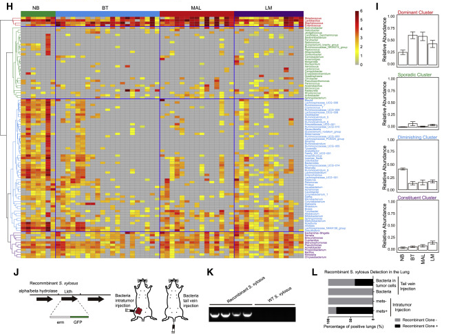 為了可視化腫瘤轉(zhuǎn)移過(guò)程中微生物群的動(dòng)態(tài)變化,研究人員繪制了不同樣本中不同細(xì)菌屬的豐度,以NB、BT、MAL、LM的順序作為腫瘤進(jìn)展的指示。有趣的是,無(wú)監(jiān)督聚類將細(xì)菌分為具有不同動(dòng)態(tài)模式的四類(圖4H和4I)。顯性聚類增加了乳腺組織中的豐度,微轉(zhuǎn)移持續(xù),大轉(zhuǎn)移減少(圖4H和4I)。
