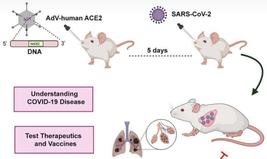 新型小鼠模型制備新冠小鼠模型除了轉(zhuǎn)基因的方式之外,還有用腺病毒載體轉(zhuǎn)導(dǎo)hACE2制備新冠模型小鼠的方法。2020年6月10日,廣州呼吸疾病國(guó)家重點(diǎn)實(shí)驗(yàn)室趙金存教授團(tuán)隊(duì)聯(lián)合多家單位共同發(fā)表了利用腺病毒載體制備的新冠小鼠模型,如下圖所示,該研究通過(guò)復(fù)制缺陷型腺病毒(Ad5-hACE2)將外源hACE2通過(guò)鼻內(nèi)轉(zhuǎn)導(dǎo)的方式遞送入C57BL/6和BALB/c兩種品系及相應(yīng)基因敲除的小鼠中,對(duì)小鼠進(jìn)行攻毒實(shí)驗(yàn),通過(guò)免疫印跡和流式細(xì)胞術(shù)檢測(cè)hACE2的表達(dá)。